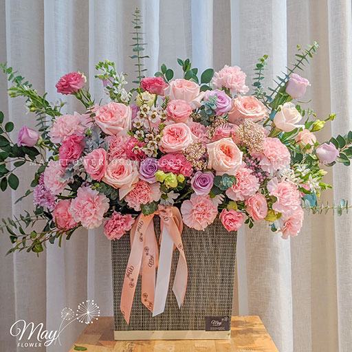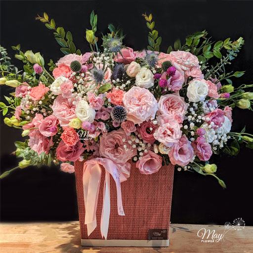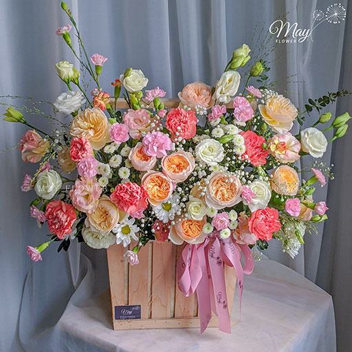 Giỏ hoa nhẹ nhàng tinh khiết, vừa xinh để tặng, vừa đẹp để bàn trang trí. Được đội ngũ Florist nhà May thiết kế theo phong cách Hàn Quốc vô cùng bắt mắt.