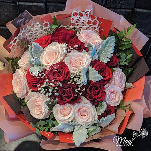 Bó hoa hồng đỏ đẹp kết hợp hồng đỏ truyền kỳ và hồng kem dâu, sự kết hợp hoàn hảo thể hiện tình yêu đong đầy, nhẹ nhàng mà sâu sắc.