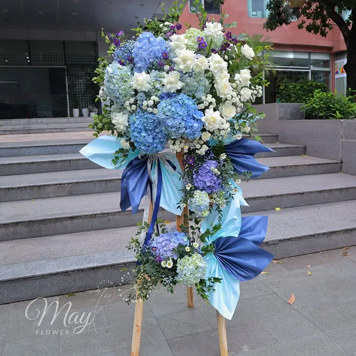 Bình An Nở Rộ – Kệ hoa giống như bầu trời và đại dương, tạo ra một không gian tĩnh lặng và dễ chịu. Ngoài ra sắc hoa còn biểu hiện cho sự tin cậy, ổn định.