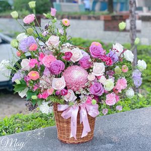 Chạy về phía anh là giỏ hoa tone hồng tím gửi gắm thông điệp về một lời đề nghị bắt đầu một tình yêu