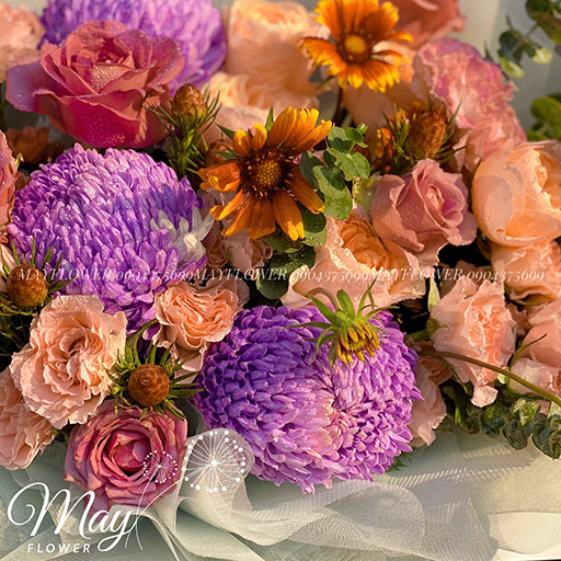 Cô nàng màu tím là bó hoa mang tone màu chủ đạo là tím hồng; bó hoa làm người ta liên tưởng tới 1 cô thiếu nữ hay mộng mơ tràn đầy năng lượng.