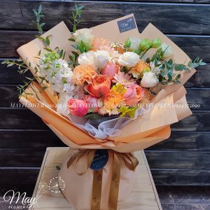 Để ngày mai luôn tới là bó hoa tonetrắng cam được phối hợp đẹp mắt giữa hoa hồng Kahala và phi yến trắng tại shop hoa tươi Mayflower