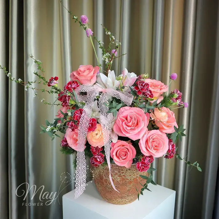 Lưu ý: Đây là sản phẩm hoa tươi tự nhiên nên có thể có chút khác biệt theo các mùa trong năm. Trường hợp không đủ số lượng hoa như mẫu đã chọn, nhân viên tư vấn sẽ liên hệ với Quý khách hàng để lựa chọn mẫu hoa thay thế phù hợp