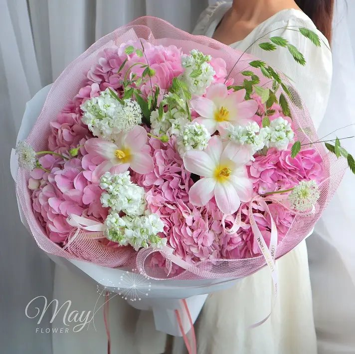 Giấc Mơ Tú Cầu – Bó hoa cẩm tú cầu thanh thoát, nhẹ nhàng là sự kết hợp hài hòa giữa sắc trắng thuần khiết và sắc hồng dịu ngọt.