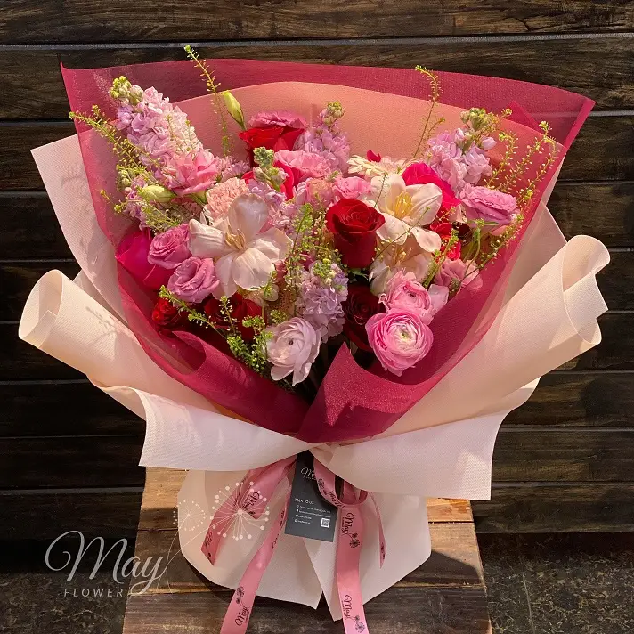 Nếu bạn đang tìm một món quà vừa nổi bật vừa tinh tế, bó hoa Gió Xuân Mơ là lựa chọn dễ khiến người nhận mỉm cười ngay từ khoảnh khắc đầu tiên. Tông đỏ – hồng được phối khéo để tạo cảm giác ấm áp, lãng mạn nhưng không hề “gắt”.