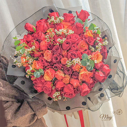 Bó hoa Gửi tặng em mang ton màu đỏ cam sâu sắc mà ngọt ngào. Biểu tượng của sự lãng mạn, của tình yêu nồng cháy, truyền tải những cảm xúc sâu sắc