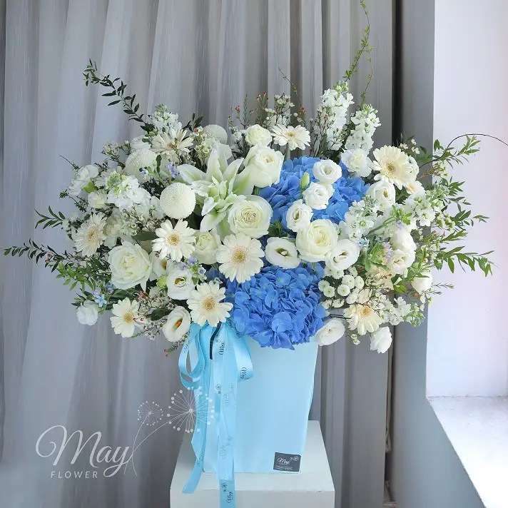 Hẹn Mùa Hoa Nở – Lẵng hoa tone trắng xanh mát dịu mang đến thông điệp về sự đáng tin cậy và sự ổn định trong mối quan hệ.