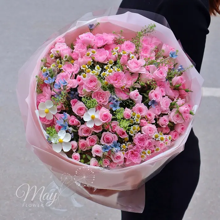 Hoa Bé Xinh – Bó hoa với những hồng nhỏ xinh xếp thành chùm mang đến cảm giác viên mãn, đầy đặn và tươi vui, thể hiện tình yêu thương, sự quan tâm.