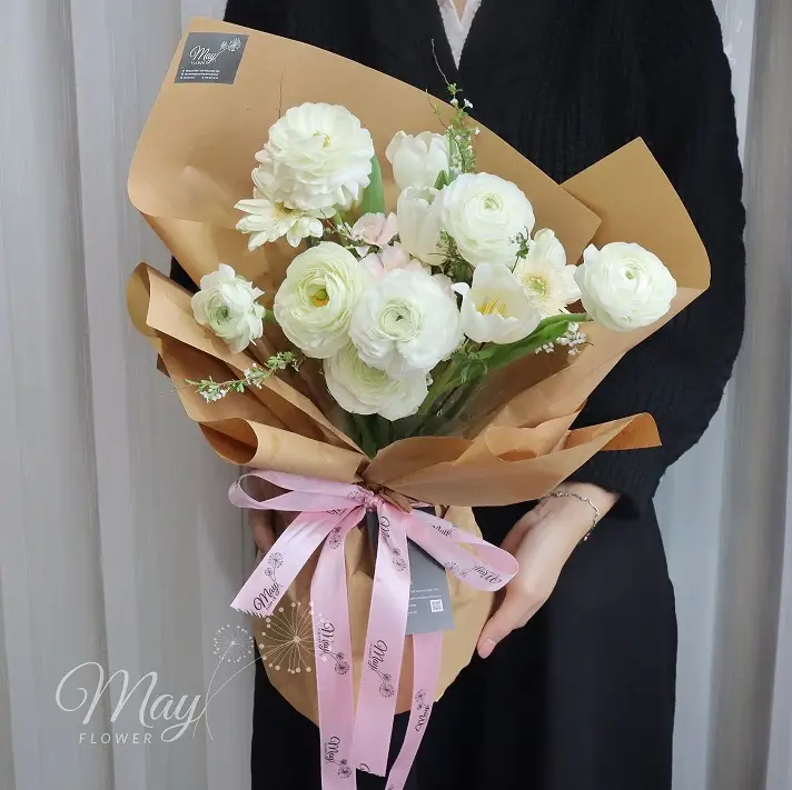 Hoa Đương Thì tone trắng từ tulip, mao lương, đồng tiền nhí—bó hoa tinh khôi để gửi lời thương, lời xin lỗi hoặc chúc mừng trang nhã.
