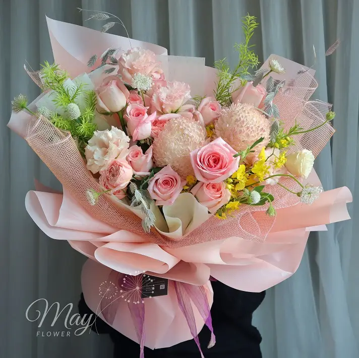 Lưu ý: Đây là sản phẩm hoa tươi tự nhiên nên có thể có chút khác biệt theo các mùa trong năm. Trường hợp không đủ số lượng hoa như mẫu đã chọn, nhân viên tư vấn sẽ liên hệ với Quý khách hàng để lựa chọn mẫu hoa thay thế phù hợp
