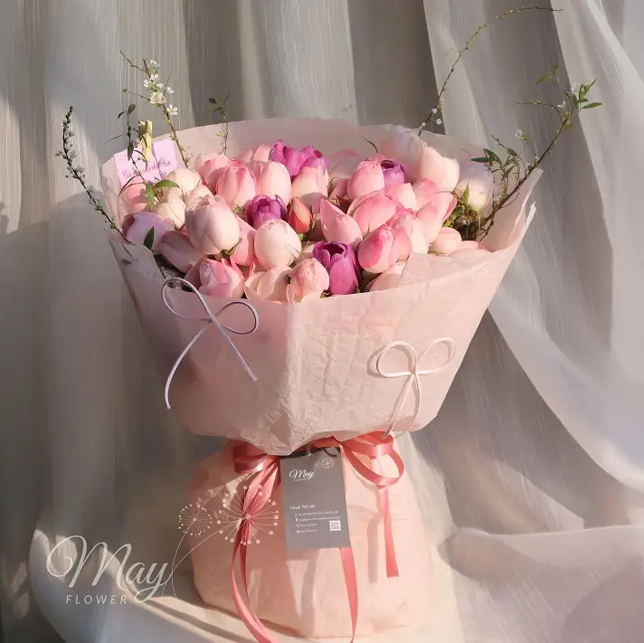 Hoa Trong Em – Bó hoa với gam hồng nhẹ nhàng mang đến cảm giác ấm áp, ngọt ngào kết hợp với sắc tulip tím mang sự sang trọng và nét đẹp quý phái.