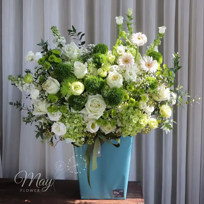 Lưu ý: Đây là sản phẩm hoa tươi tự nhiên nên có thể có chút khác biệt theo các mùa trong năm. Trường hợp không đủ số lượng hoa như mẫu đã chọn, nhân viên tư vấn sẽ liên hệ với Quý khách hàng để lựa chọn mẫu hoa thay thế phù hợp