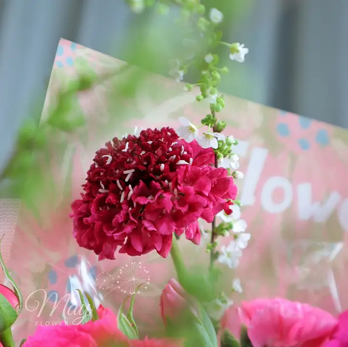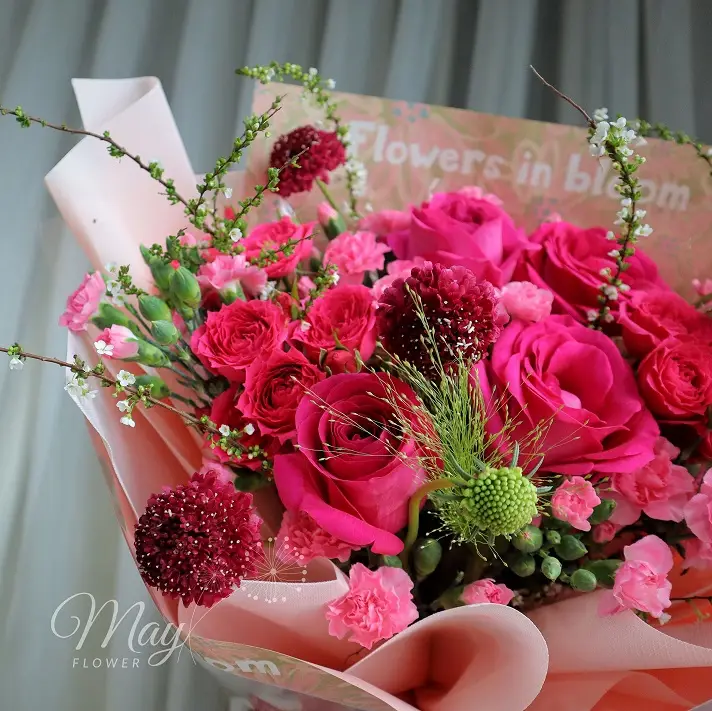 Bó hoa Hồng Cháy Đam Mê phối hồng Pink Floyd, hồng chùm Sophie và scabiosa đỏ rực, sang trọng, giao nhanh tại Mayflower.