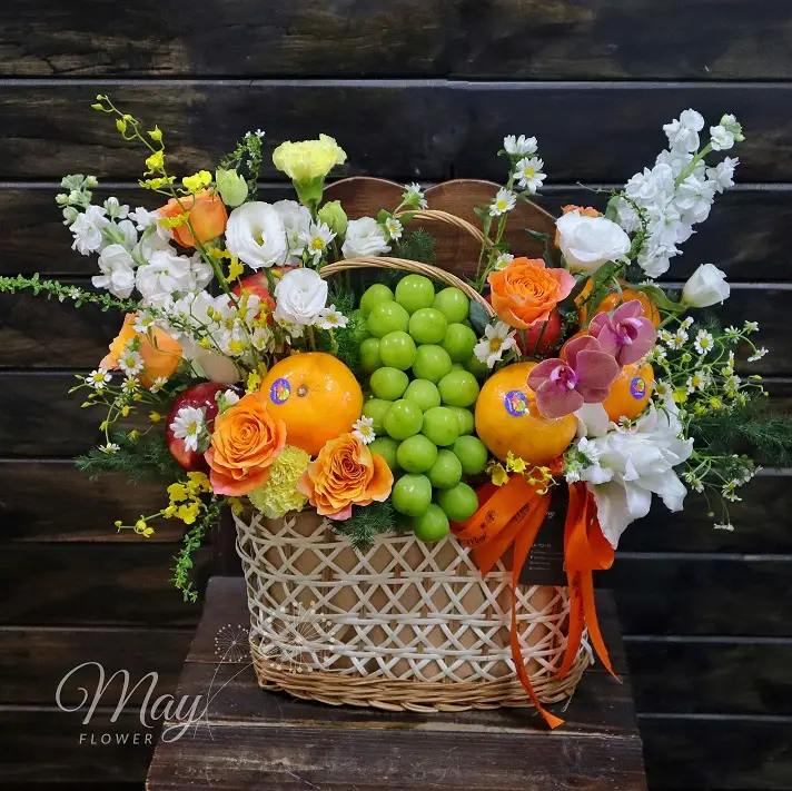 Lộc Cát Tường – Giỏ hoa quả với đầy đủ hoa và quả mang nhiều ý nghĩa tượng trưng cho sự ấm áp, may mắn và hạnh phúc viên mãn.