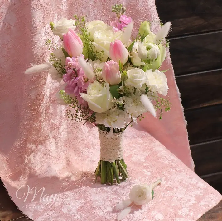 Lời Hẹn Một Đời – Bó hoa cưới tone trắng hồng nhẹ nhàng mang cảm giác ấm áp, lãng mạn, rất phù hợp với không khí ngọt ngào của ngày cưới.