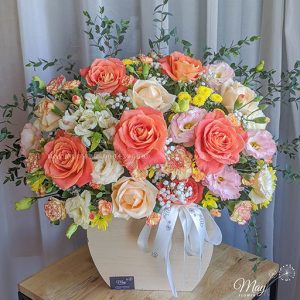 Lẵng hoa Lửa tình – lẵng hoa hồng cam mix hồng kem vàng