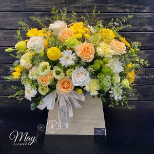 Mây Trôi Chiều Tà – lẵng hoa tone vàng cam rực rỡ đem đến sự tài lộc, may mắn trong cuộc sống