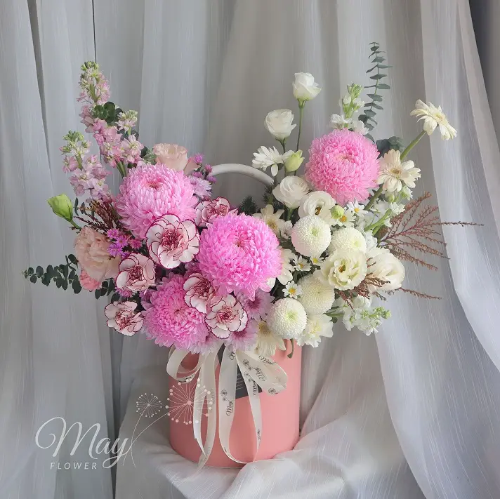 Mộc Sắc – Lẵng hoa mang vẻ đẹp ngọt ngào, đầy đặn và sang trọng. Sắc màu của hoa tượng trưng cho tình cảm lãng mạn, sự ngọt ngào và hạnh phúc viên mãn.