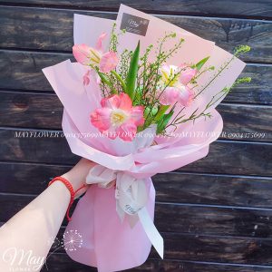 Bó hoa Một cơn gió – Tulip hồng mang ý nghĩa là bạ đang thể hiện sự quan tâm, chăm sóc và gửi đến người nhận những lời chúc tốt đẹp nhất.