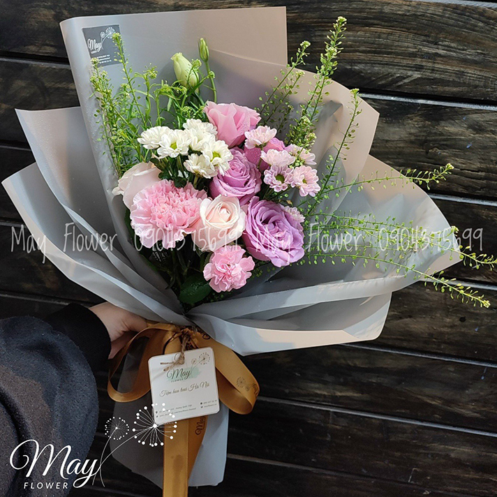 NHẸ NHÀNG YÊU EM – Bó hoa tone hồng tím phối hợp giữa hồng tím và các loại hoa tone nhẹ nhàng, biểu tượng cho 1 tình yêu chung thủy, tình yêu chân thành