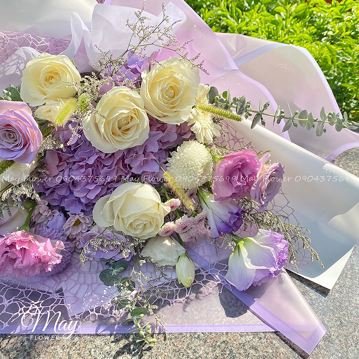 Nhẹ Nhàng Yêu – bó hoa tone trắng tím pastel mang ý nghĩa tượng trưng cho mối quan hệ gắn kết, một tình yêu bền vững theo năm tháng.
