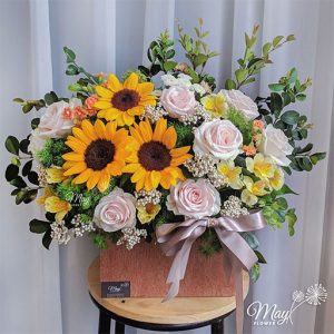 Sắc vàng rực rỡ là lẵng hoa hồng kem dâu nhẹ nhàng kết hợp với những bông hoa hướng dương tạo điểm nhấn. Một sự kết hợp tương phản nhưng lại tạo được hiệu ứng bắt mắt cho người nhìn.