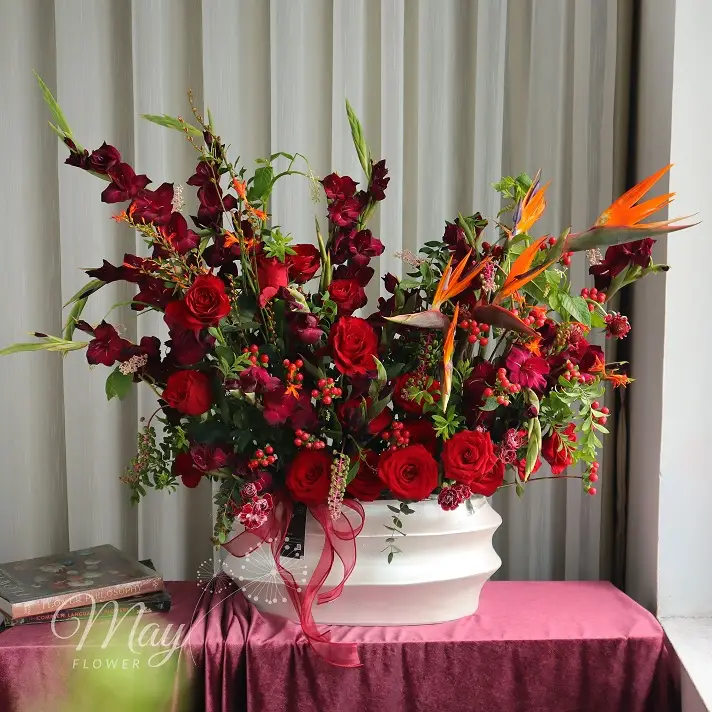 Sự Vẹn Toàn – Bình hoa thể hiện niềm vui, sức sống mạnh mẽ và nhiệt huyết. Đồng thời, sắc đỏ còn bày tỏ sự mạnh mẽ và sang trọng.