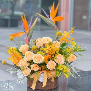 Giỏ hoa hồng cam Thời gian cứ trôi là biểu tượng của lòng nhiệt huyết, sự phiêu lưu, có chút liều lĩnh và đam mê của tuổi trẻ.