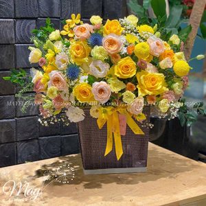 Lẵng hoa thời gian ngọt ngào mang tone màu vàng cam nhẹ nhàng, kết hợp hồng juliet thoang thoảng thơm- 1 sản phẩm hoàn hảo.