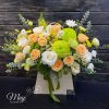 Tinh Tế – Lẵng hoa kem vàng mix cùng cúc mẫu đơn, tone trắng cam một màu sắc tượng trưng cho một sự bắt đầu, sự khởi đầu mới.