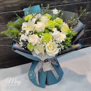 Tình Yêu Cuối – bó hoa tone trắng xanh nhẹ nhàng, trang nhã thích hợp làm quà tặng cho nam hoặc những người thích giản dị.