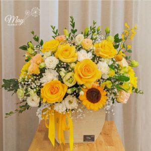 Lẵng hoa Từ đó được mix từ hồng vàng và hướng dương với mong muốn chúc người nhận hạnh phúc và thành công.