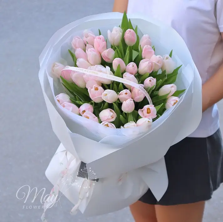 Tulip Khởi Sắc là bó hoa với những bông hoa tulip mịn màng và nở đều, tựa như những nụ cười nhẹ nhàng, ngập tràn sự ấm áp và yêu thương.