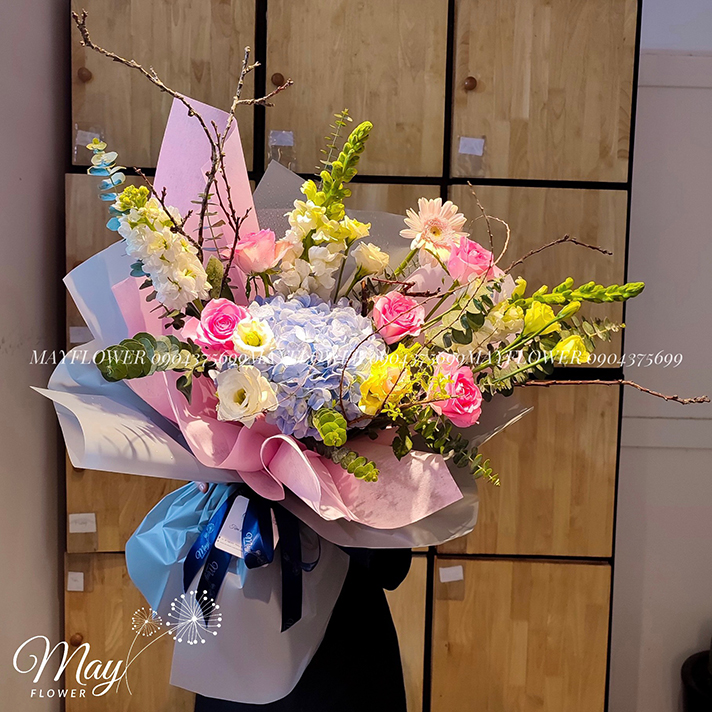Ước Muốn Lấp Lánh – Bó hoa với thiết kế form dáng độc đáo cùng với sự kết hợp hài hòa giữa các loại hoa quen thuộc như cẩm tú cầu, hồng, phi yến…