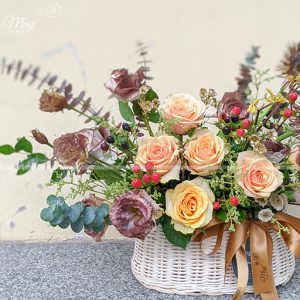 Giỏ hoa Vượt Qua Màn Đêm tone màu vàng nâu đằm thắm, quý phái, ngọt ngào là biểu tượng cho lòng tin, sự tôn trọng và cả lòng trắc ẩn.